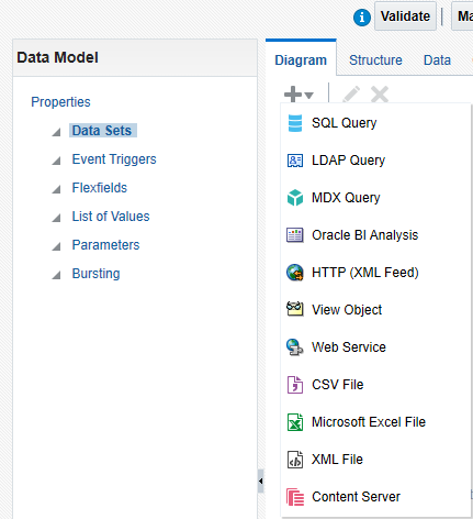 Step 2: The properties of the data model will be shown on the left-hand side of the window, we can customize the data model such as adding parameter selections. Click on the “+” sign on the top-left corner in the ‘Diagram’ tab to create the new data set. Then select “SQL query”. A window will pop-up to create the script.