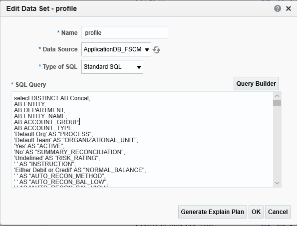 Step 3: For the data source, select “ApplicationDB_FSCM” and “Standard SQL” for Type of SQL selection. Name the data model the way you want.