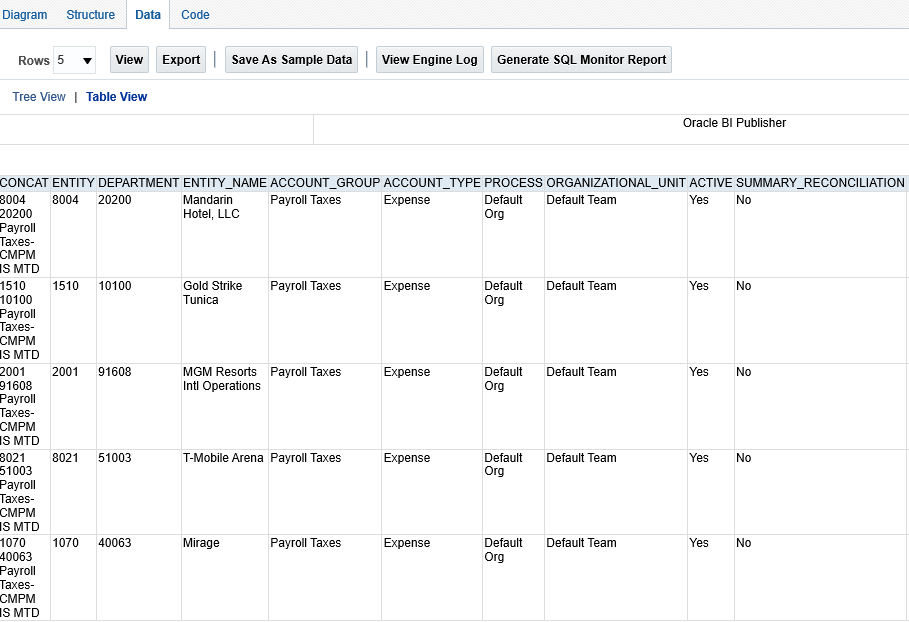 Step 7: After completing the script, click on the save icon in the top-right corner, input the name and select the folder you want to save it into. Before we can start creating the report layout, we need to generate a set of sample data so that it can be used while building the report layout. Click on the “Data” tab and select how many numbers of rows to display (there are options to show from 5 up to 200 rows). The purpose of this step is usually to validate the data. Click “View” to proceed and select the “Table View”. Then click “Save As Sample Data” if this data set is okay and ready to build the report layout.