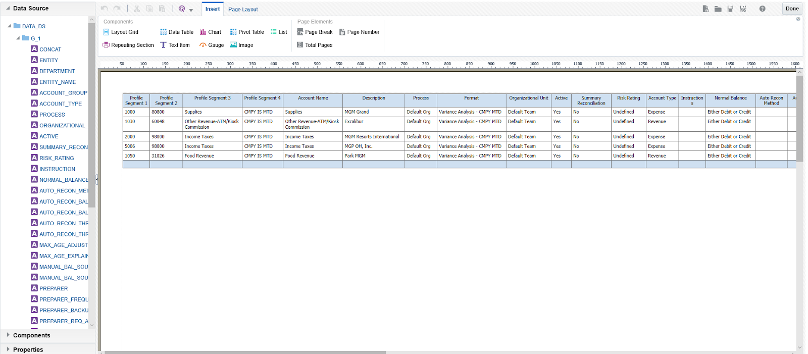 Step 9: Under the “Data Source” on the left-hand side, all columns built in the data model show up. Drag and drop the columns to the table area and adjust the width to fit the page and content. There are options to change the headers just by double clicking on the field or changing the formatting is under the “Properties” tab. Save it once finished by clicking “Done”.